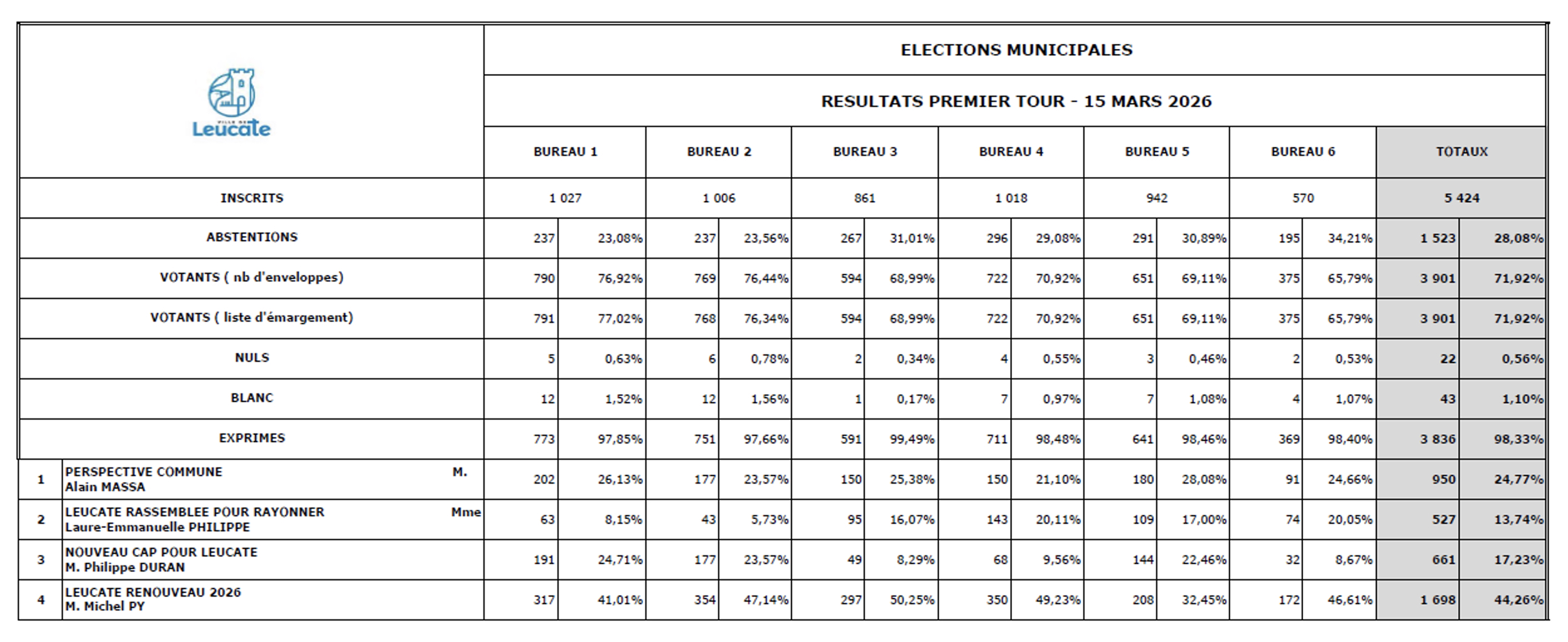 Site officiel de la commune de Leucate :: :: Élections municipales 2026 : résultats du 1er tour à Leucate
