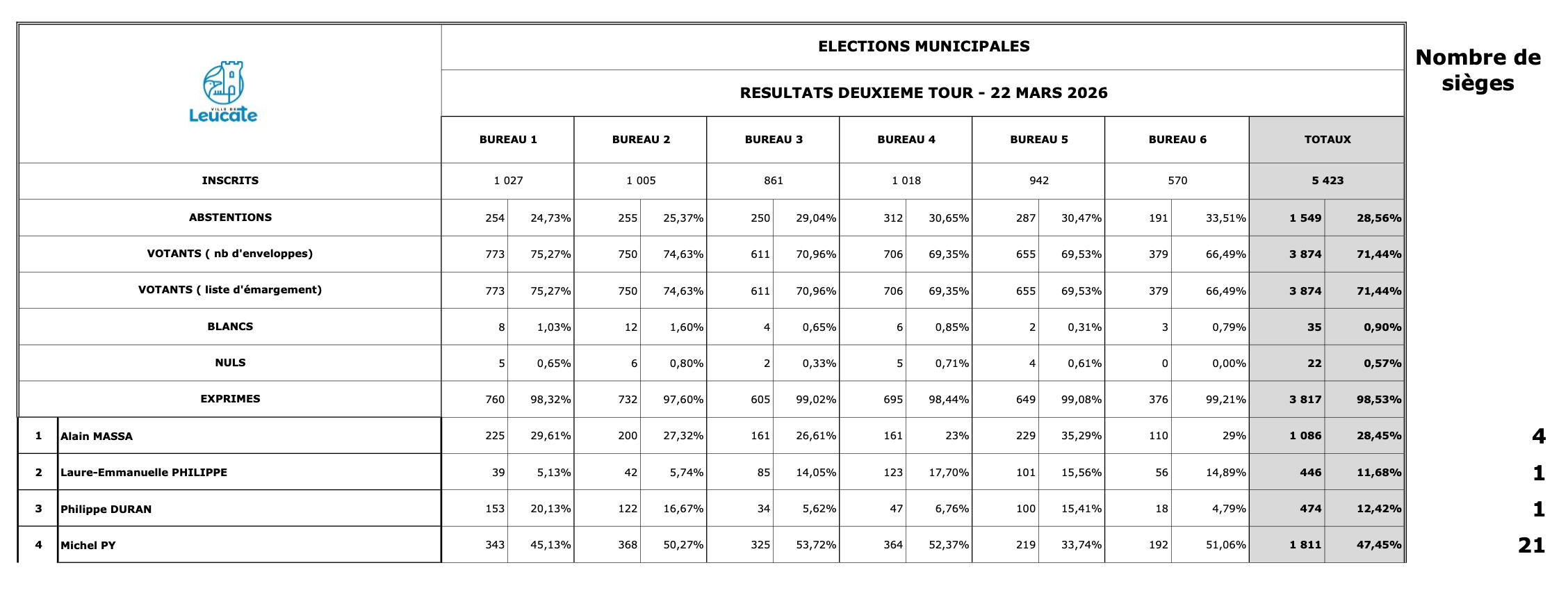 Site officiel de la commune de Leucate :: :: Élections municipales 2026 : résultats du 2nd tour à Leucate